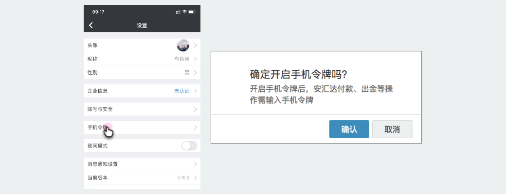 点击安汇达 “手机令牌” 验证身份并开启手机令牌